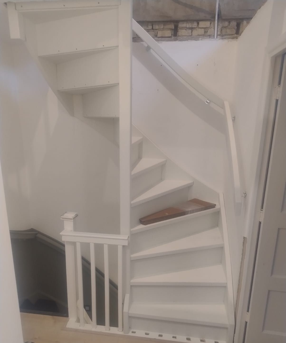 De vader des huizes is erg handig en heeft zelf het trapgat gemaakt. Daarna konden wij langskomen om alles nauwkeurig in te meten, zodat de trap precies op maat gemaakt kon worden. Binnen ongeveer vier weken hebben wij de halfslag, witgegronde zoldertrap geplaatst, boven de bestaande verdiepingstrap. Het traphekje is op maat gemaakt en hergebruikt, voor een mooie, complete oplossing. De verdere afwerking verzorgde de klant zelf. Uiteraard kunnen wij het hele proces van A tot Z uit handen nemen, maar dat hoeft bij dit handige stel niet.