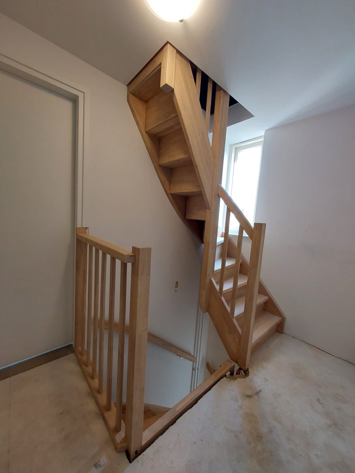 Twee volledig hardhouten rubberwood trappen, met leuning en helwerk op de verdieping- en zoldervloer, voorzien van een monocoat eindbehandeling, komt de prijs op € 8.950