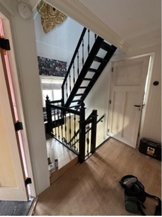 Uiteraard! De familie had net hun nieuwe woning gekocht en was volop aan het verbouwen. Het verwijderen van de oude trap hebben zij zelf gedaan, waarna wij een veilige en comfortabele onderkwart vuren trap hebben geplaatst, zwart gegrond voor een stijlvolle uitstraling. De bestaande traphekjes zijn hergebruikt, iets wat wij graag stimuleren.